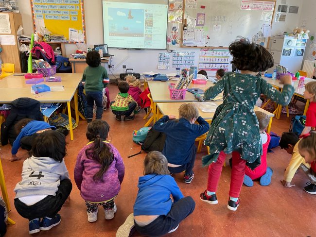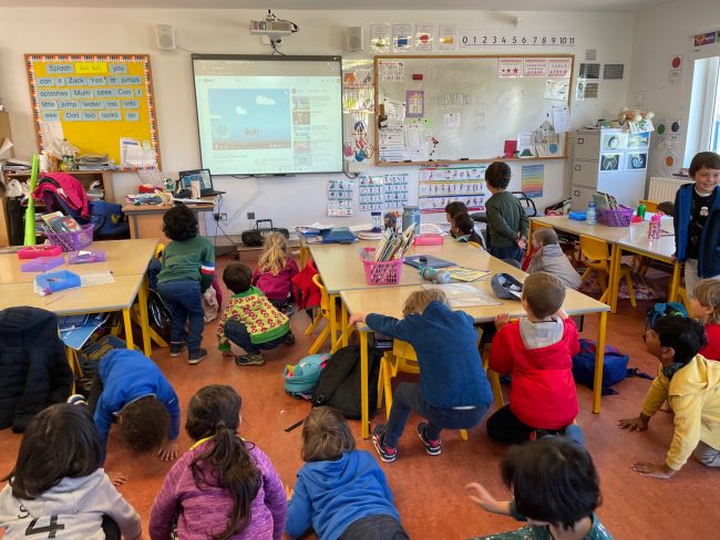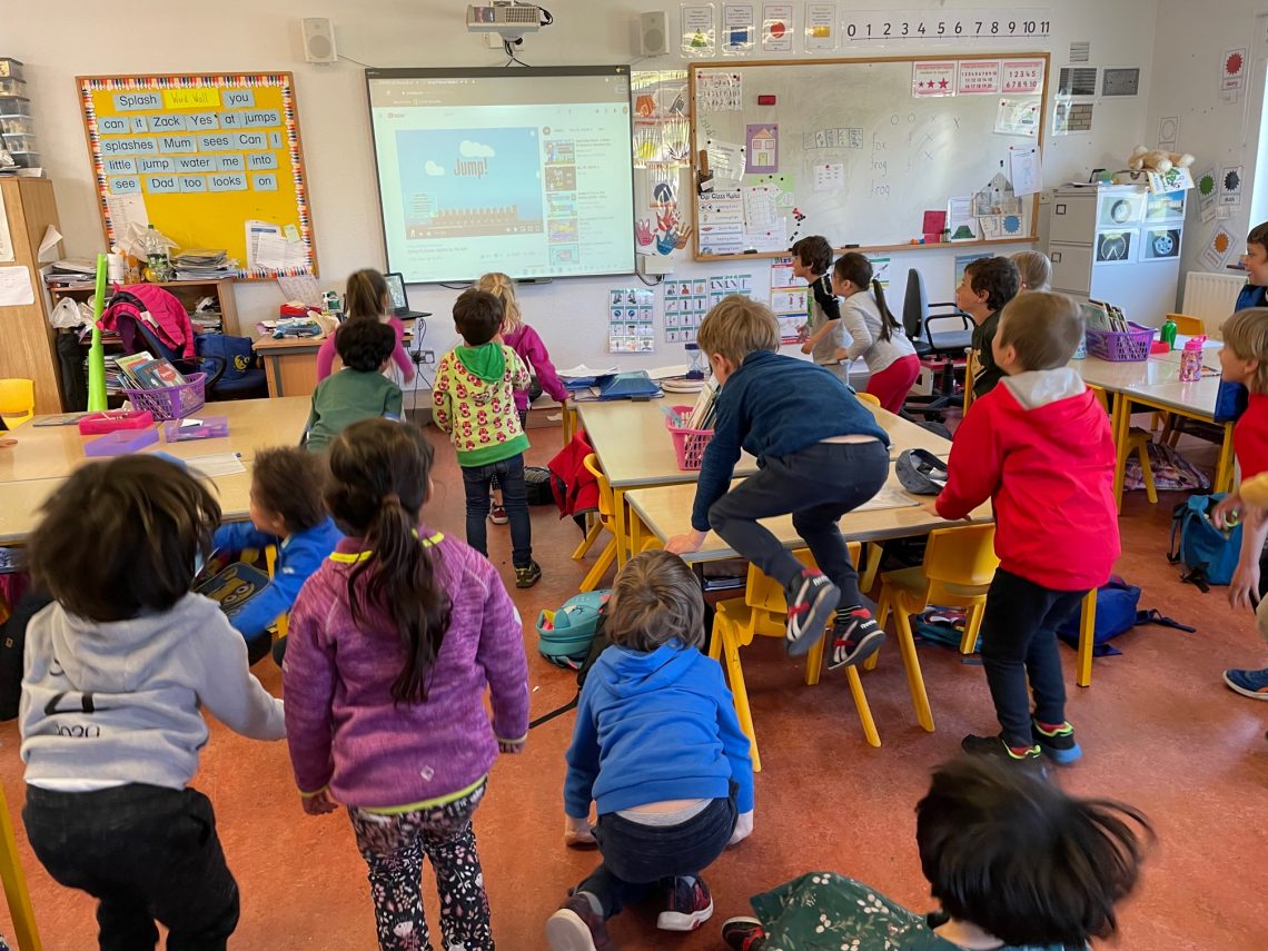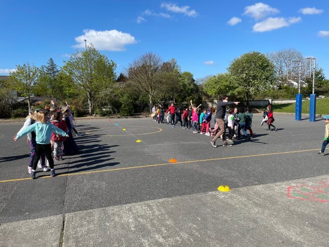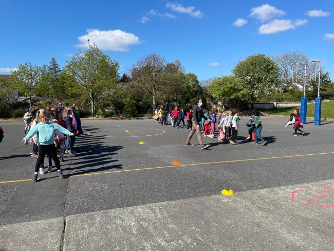 Junior and Senior Infants doing star jumps while on their Active Line