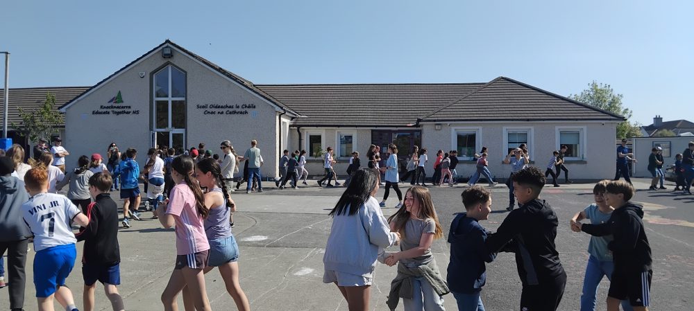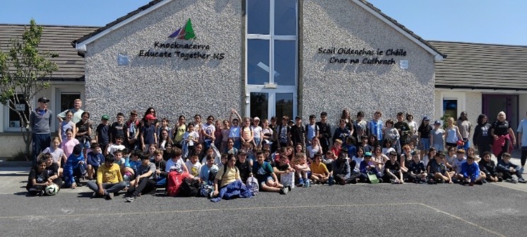 This week we had a very special visit from 50 children from Nimes, France. 5th and 6th Class have been writing letters to their French penpals over the year, and it has been an excellent way to put into practice the learning from the French lessons with Lise earlier this year. The classes meet each other for the first time in Cong where we toured the abbey, had a walk in the woods and enjoyed some games together. Today our visitors from Nimes came to the school. We demonstrated and taught some Irish dances (An Dreolín and Shoe the Donkey), we played Gaelic football and Banana Tag in Cappagh Park and we even sang for each other! Special thanks to Lise for her assistance.