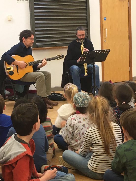 The whole school enjoyed a jazz concert on Tuesday morning.  Bertrand, Melissa’s dad, came with his friend Frank, a guitarist.  They played fantastic music, and everyone enjoyed it tremendously.  It even inspired us to have a jazz playlist for the Friday disco during yard time.