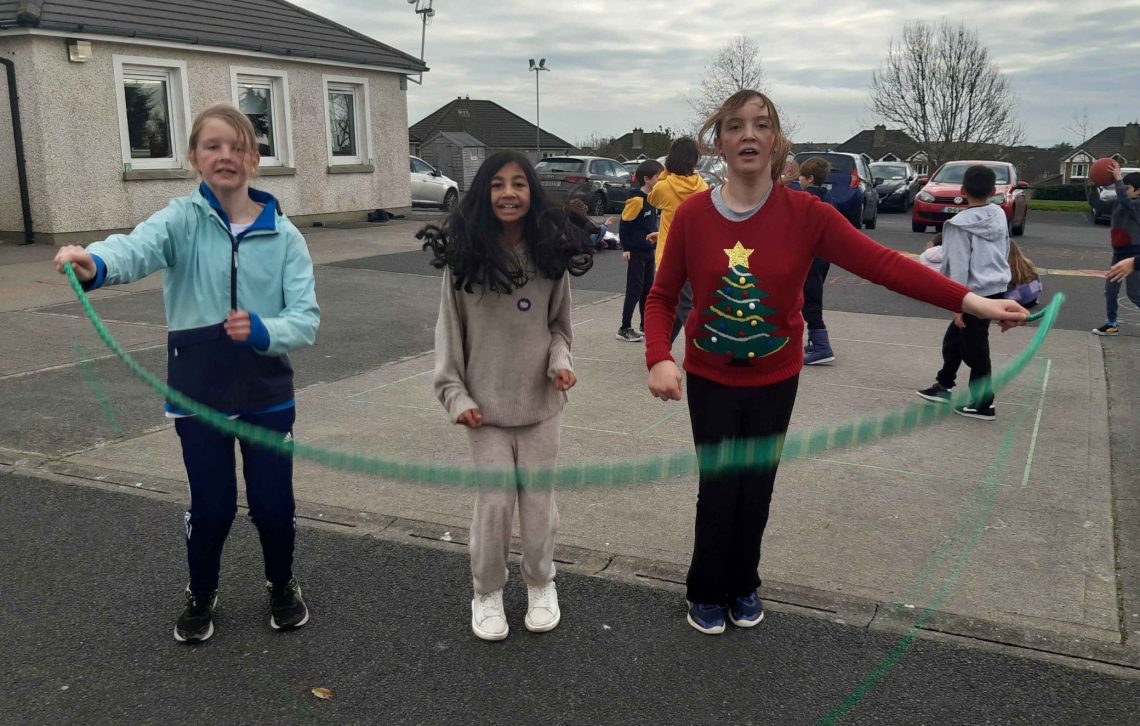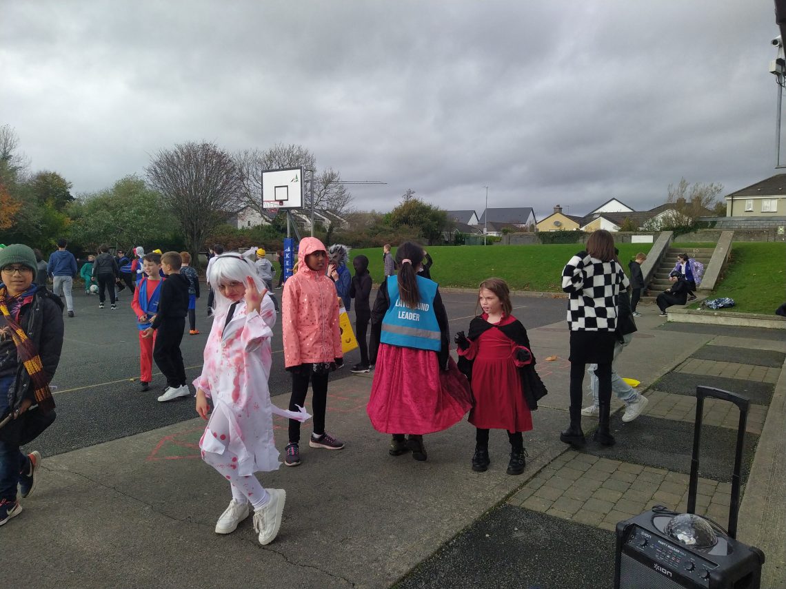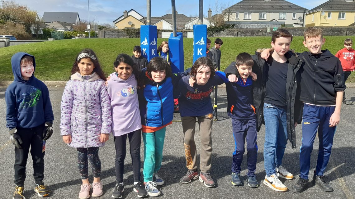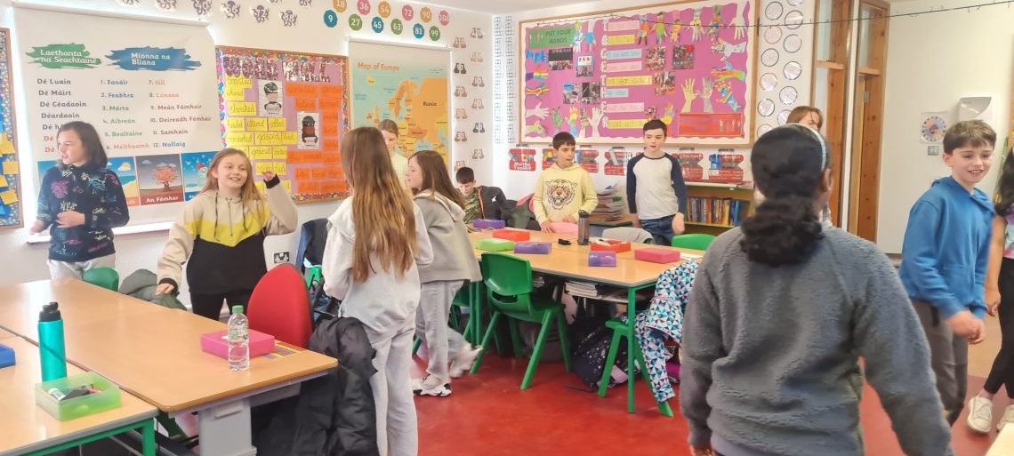 Here are 5th Class having their Bizzy Break, a movement break. 2nd Class having their Bizzy Break, a stretching break.