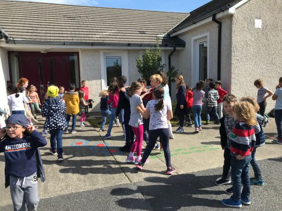 Junior Infants balancing on stilts All classes playing football in the yard Fourth Class playing football