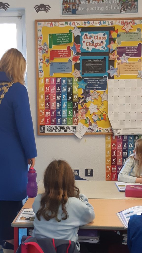 The entire school community marked today as World Children’s Day. This date is chosen because it was on 20th November 1989 that the International Convention on the Rights of the Child Rights was adopted by the United Nations General Assembly. We were delighted to welcome the Mayor Of Galway, Clodagh Higgins, to the school to mark the occasion. The Mayor visited several classrooms and had a great conversation with the Student Council members.