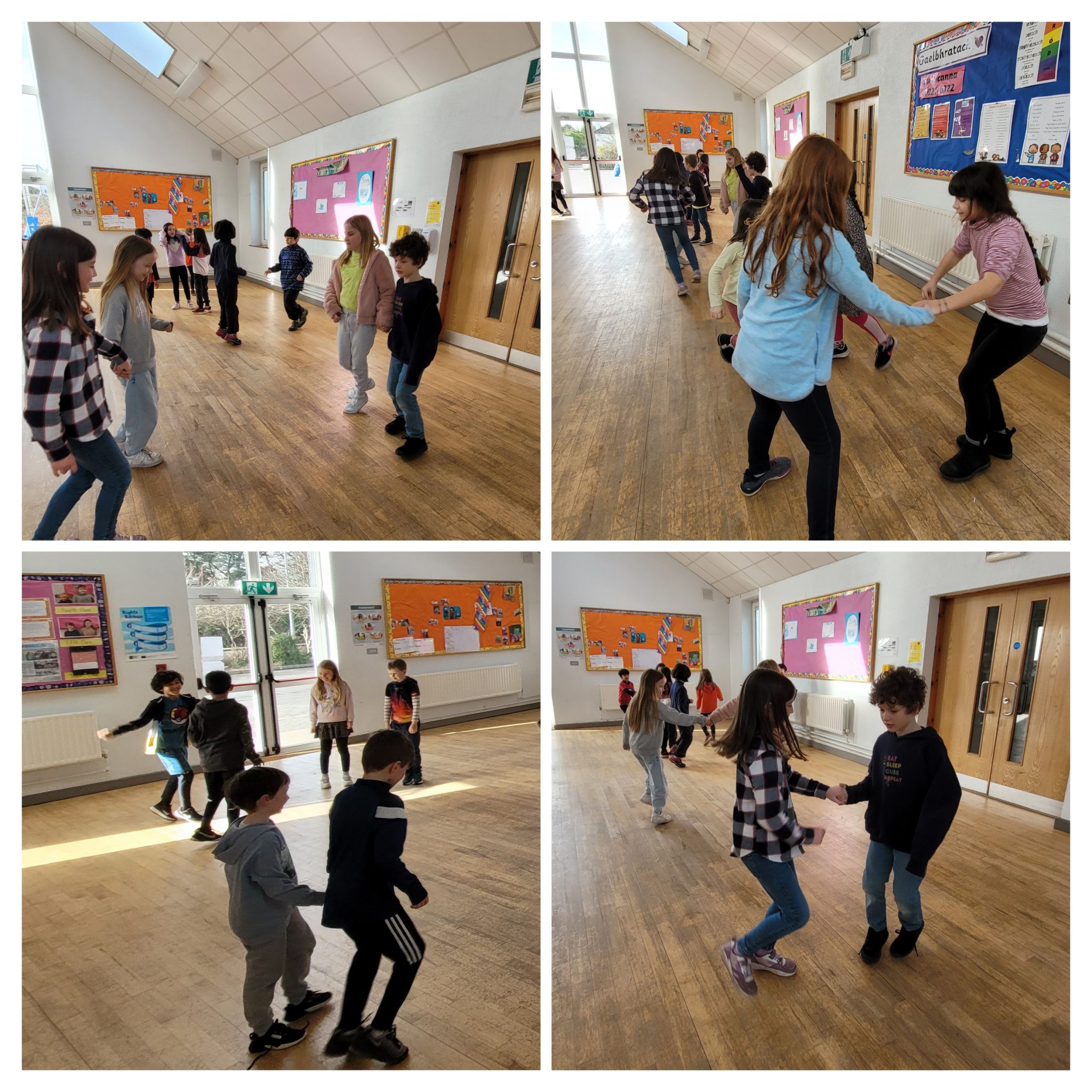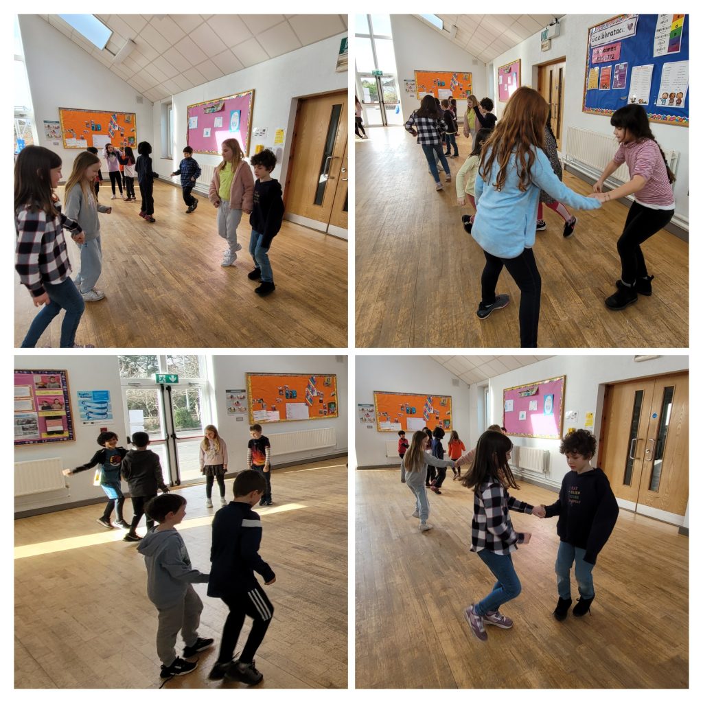 Rang a Dó are learning some Irish Dance steps in PE class. As well as learning how to dance the “Aon, Dó, Trí’s” /”One, two, three’s”, they gave the Ballaí Luimnigh (Walls of Limerick) a go. Bhí an spraoi acu. (They had lots of fun!) Maith sibh, Rang a Dó!