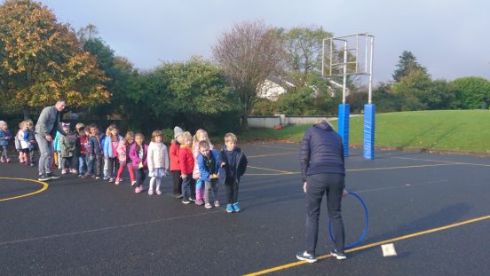 The weather was so mild today that the Junior Infants had their Physical Education Class (PE) outside. Here they are practicing their hand eye coordination using bean bags.