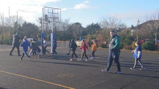 Craig from Connacht Rugby teaching 3rd Class how to play Rugby