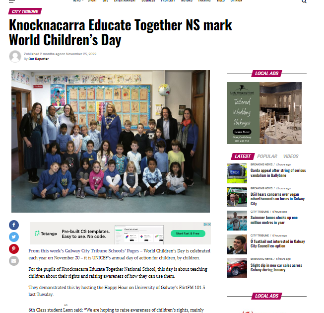 The Student Council wrote an article which was published in the Galway City Tribune. The article can be found at the link below. They wanted to inform the public about World Children’s Day and how our school was going to mark the occasion.